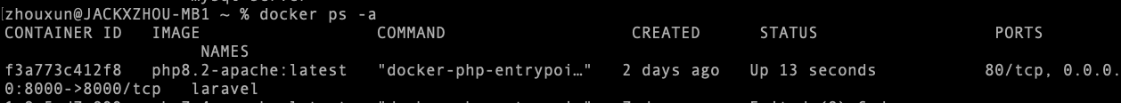 docker run --name laravel --network my_network -v /Users/zhouxun/Documents/www/php8.2:/var/www/html -p 8000:8000 -d php8.2-apache:latest