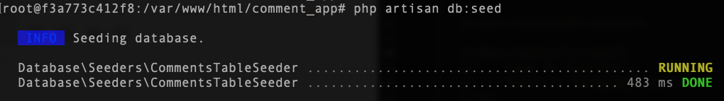 要将测试数据写入数据库,如下所示执行php artisan db:seed命令。根据情况,也可以确认迁移的状态后再执行。