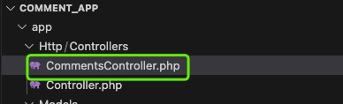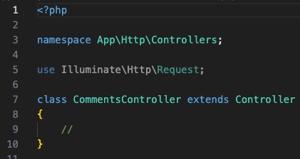 创建CommentsController使用命令:php artisan make:controller CommentsController,在app/Http/Controllers/目录下生成CommentsController.php,如下
