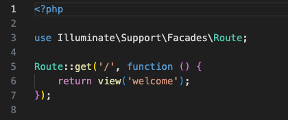 以上代码表示:对于/的请求,定义了调用名为welcome的视图。具体的意思是调用名为resources/views/welcome.blade.php的文件(视图文件)